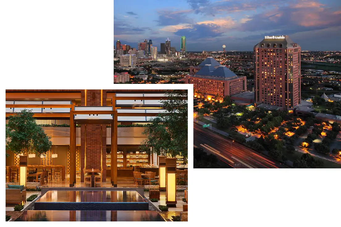 Stay onsite and save! Discounted guest rooms are available onsite at the Hilton Anatole for $259 per night and are subject to an additional $18 resort fee per room, per night, plus 17.26% room tax. Taxes and fees are subject to change without notice. Be sure to read Hilton Anatole’s fine print.